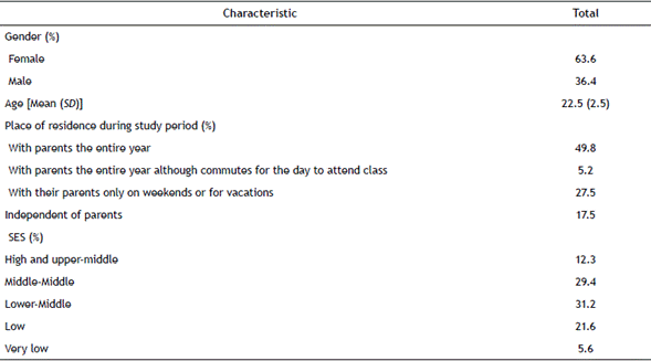 The convenience sample consisted of 269 students (63.6% women) from the five aforementioned state universities. Although the minimum sample size required was 244, we collected data from more participants based on the expectation of our error responses. A post hoc analysis suggested that the power (1-ß) = 0.96 given Cronbach's alpha, sample size, and effect size. Participants were enrolled in the following programs: Agronomy, Public Accounting, Psychology, Biotechnology, Commercial Engineering and Veterinary Medicine. All participants were volunteers with a mean age of 22.5 years old (SD = 2.5). 95.5% resided in an urban area (Table 1). The sample mainly consisted of students living with their parents all year round or students living with their parents during weekends or vacations. Most students belonged to the middle-middle and lower-middle socioeconomic statuses (SES). Education level and head of household occupation were used to determine a family's SES (Adimark, 2004).