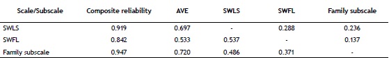 The first step carried out was to validate the scales through CFA. The scales used in the analysis satisfied the composite reliability test (above 0.7) and AVE values (above 0.5) (Table 2). The value of the squared correlation between the SWFL and SWLS was lower than the AVE of the scale factors, which verified the discriminant validity between the constructs (Lévy &Varela, 2006). The discriminant validity between the SWLS and the Family subscale and between the SWFL and the Family subscale was also verified. For each scale, the standardized factor loadings for all items were above 0.5 and statistically significant. Thus, it was concluded that there was convergent validity. Therefore, the measurement model presented adequate internal validity.