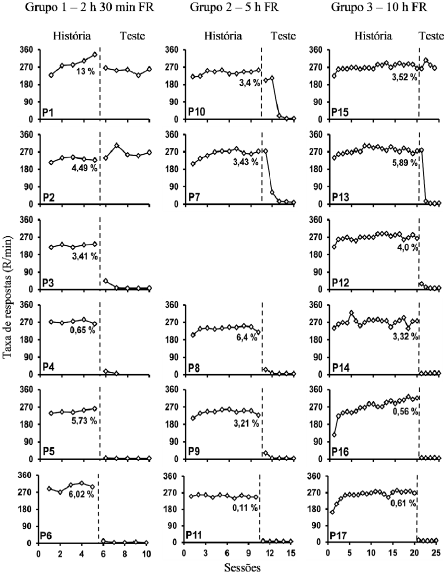 A Figura 1 exibe as taxas de respostas por minuto (R/min) para cada participante dos grupos 1, 2 e 3 nas fases de história (5, 10 e 20 sessões com FR, respectivamente) e de teste (FI-custo). Os participantes P4 (Grupo 1) e P15 (Grupo 3) abandonaram a pesquisa antes de cumprir as cinco sessões em FI-custo previstas no procedimento. Para facilitar a visualização dos resultados, em cada coluna da Figura 1 os gráficos foram ordenados, de cima para baixo, em função dos participantes que apresentaram comportamento mais persistente na fase de teste até os que apresentaram menor persistência.