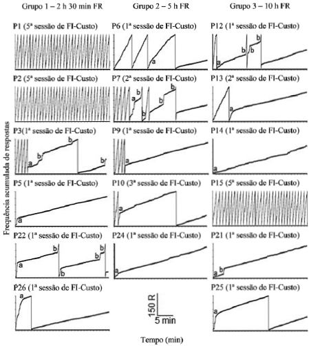 Foram identificados, nos registros cumulativos examinados, três padrões de transição de taxas de respostas altas para relativamente mais baixas durante FI-custo: (a) altas taxas de respostas (i.e., sem transição, quando nenhuma letra está presente nos gráficos - P1 e P2 do Grupo 1; P15 do Grupo 3); (b) mudança de taxas de respostas alta para baixas e manutenção de taxas de respostas relativamente mais baixas (gráficos com apenas a letra a - P5 e P26 do Grupo 1; P6, P9, P10, P24 do Grupo 2; P13, P14 e P25 do Grupo 3) e (c) transição de taxas de respostas altas para relativamente mais baixas, com aumentos ocasionais da taxa no decorrer da sessão (gráficos com letras a e b - P3 e P22 do Grupo 1; P7 do Grupo 2; P12 e P21 do Grupo 3). Não houve relação sistemática entre esses padrões e a extensão da história, visto que houve incidência de dois ou três desses padrões para os participantes de todos os grupos do experimento. Portanto, quando a taxa de respostas mudou, a mudança foi em alguns casos relativamente "abrupta" (descritos pelo Padrão 2, acima) ou de maneira cíclica (descritos pelo Padrão 3, acima).