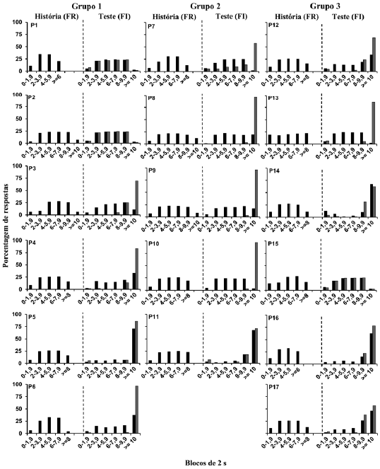 Durante a exposição ao FI-custo, é possível observar três padrões na distribuição das respostas durante o IRI: (a) um padrão semelhante ao da Fase 1 tanto na primeira quanto na última sessão do FI-custo (i.e., persistência comporta-mental) para P1 e P2 (Grupo 1) e P15 (Grupo 3). Esses são os participantes que mantiveram altas taxas de respostas após a mudança da contingência de reforço (ver Figura 1); (b) um padrão semelhante ao da Fase 1 na primeira sessão da Fase 2 (barras pretas), mas uma alteração da distribuição das respostas na última sessão da Fase 2 (barras cinzas), isto é, a maioria das respostas passou a ser emitida no final do intervalo do FI (P3 do Grupo 1; P6, P7 P9 e P10 do Grupo 2; P13 do Grupo 3); (c) uma alteração da distribuição das respostas logo na primeira sessão da Fase 2 (i.e., a maior parte das respostas passaram a ser emitidas no final do intervalo do FI), que se manteve (ou acentuou-se) na última sessão (P5, P22 e P26 do Grupo 1; P24 do Grupo 2; P12, P14, P21 e P25 do Grupo 3).