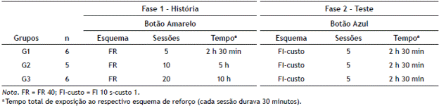 Todos os participantes foram distribuídos, por sorteio, em três grupos que passaram por duas fases experimentais resumidas na Tabela 1. Foram designadas diferentes cores para o botão de respostas a depender do esquema de reforço em vigor (como nos estudos de Costa et al., 2009; Weiner, 1965, 1969, 1970).