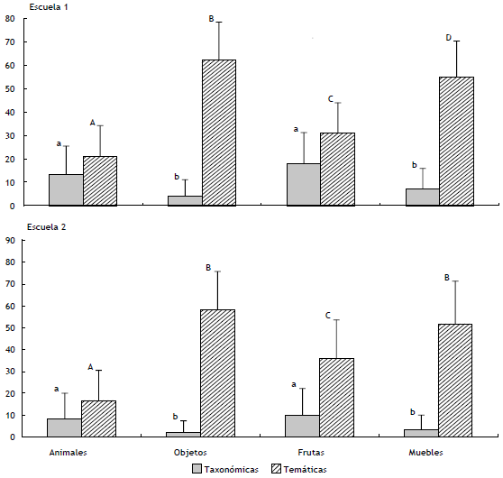 En ANIMALES y FRUTAS, las relaciones conceptuales de mayor aparición fueron las atributivas, en ambas escuelas. En OBJETOS y MUEBLES, en la escuela 1 imperaron las relaciones temáticas; en la escuela 2, también imperaron las relaciones temáticas en OBJETOS, en tanto en MUEBLES la presencia de las temáticas y las atributivas fue pareja. Las relaciones taxonómicas fueron las de menor aparición en las cuatro categorías semánticas, en ambas escuelas (ver Tabla 1).
