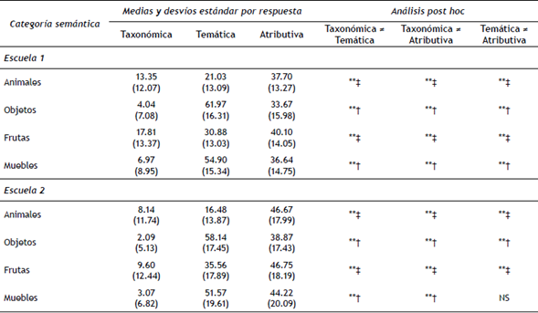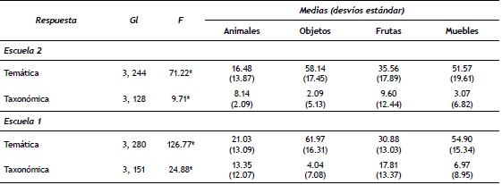 Se hallaron diferencias significativas en la distribución de las relaciones temáticas, taxonómicas y atributivas en las cuatro categorías semánticas (Escuela 1, ANIMALES: F = 66.95, gl = 2, 210, p = .00; FRUTAS: F = 48.94, gl = 2, 210, p = .00; OBJETOS: F = 424.25, gl = 2, 119, p = .00; MUEBLES: F = 296.29, gl = 2, 130, p = .00. Escuela 2, ANIMALES: F = 116.89, gl = 2, 183, p = .00; FRUTAS: F = 83.88, gl = 2, 183, p = .00; OBJETOS: F = 390.39, gl = 2, 93, p = .00. MUEBLES: F = 257.24, gl = 2, 97, p = .00).