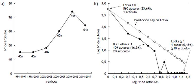 En relación con el número de artículos publicados durante el periodo contemplado, la tendencia muestra un progresivo incremento en el número de estos entre los periodos 1994-1997 y 2010-2013 (de 45 a 74 artículos publicados), seguido de una disminución en el último periodo (64 artículos en el periodo 2014-2017, véase la figura 1a). Esta disminución se debería al hecho de que el número de artículos publicados anualmente se estabilizó en 16 durante los últimos cuatro años.
