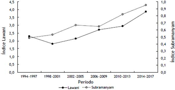 Por su parte, el grado de colaboración puede analizarse en función tanto de la proporción de artículos con dos o más autores sobre el total de documentos (Subramanyam, 1983), como a partir de la media ponderada de autores por artículo, en ambos casos en función de los periodos seleccionados (Lawani, 1981). Consistente con lo reportado anteriormente, el índice de Subramanyam registra un aumento en la proporción de artículos de colaboración entre los periodos 1994-1997 y 2014-2017, duplicando su valor. Mientras en el segundo caso, el índice de Lawani muestra un incremento en la colaboración por artículo, pasando de 2,3 autores por artículo en el periodo 1994-1997 a 3,9 autores en el periodo 2014-2017. Los valores de ambos índices por periodo se pueden observar en la figura 2.