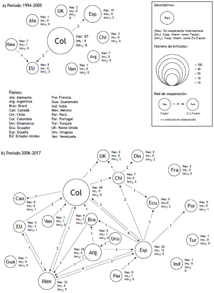 En relación con el primer periodo, se observa una preponderancia de artículos firmados por autores pertenecientes a instituciones colombianas y una escasa colaboración entre países (solo un 3,6% de total de artículos del periodo 1994-2005). En este sentido, pese a que se registran publicaciones que representan la actividad de investigación de 9 países, solo 4 de ellos reflejan algún grado de colaboración en una única dirección.