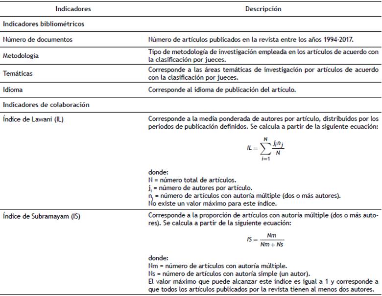 El método es de carácter bibliométrico y se realiza a partir del análisis de los artículos (Salas et al., 2017). Esta estrategia permite dar cuenta de una serie de indicadores generales y otros más específicos (véase tabla 1). La estrategia de análisis, en términos de indicadores bibliométricos y la definición de criterios temáticos y metodológicos, siguió los lineamientos propuestos por Salas et al. (2017).