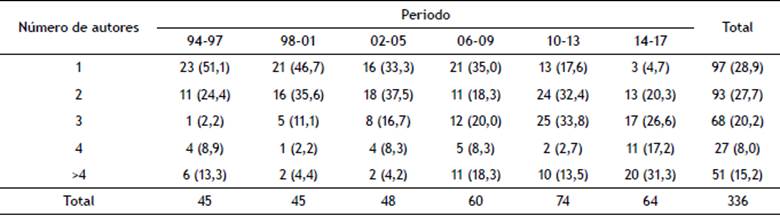 Por otra parte, al comparar el número de artículos en función del número de autores entre el primer (1994-1997) y el último periodo (2014-2017), se observa un cambio en la distribución porcentual, siendo el periodo inicial el de menor trabajo colaborativo entre autores, seguido de un aumento posterior. Esta tendencia se hace particularmente evidente al observar el decremento en el porcentaje de artículos firmados por un solo autor, el cual disminuye desde un 51,1% en el periodo 1994-1997 a un 4,7% en el periodo 2014-2017, mientras que las contribuciones con mayor colaboración se encuentran en progresivo aumento en el último periodo.