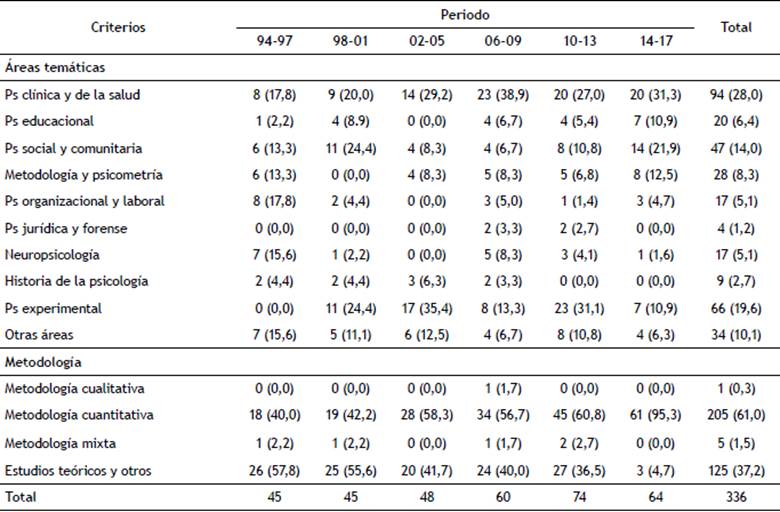 En el caso de la clasificación temática en función de los periodos de interés los resultados muestran, en términos generales, un predominio de la investigación en psicología clínica y de la salud (28%), seguido por los trabajos en psicología experimental (19,6%) y finalmente psicología social y comunitaria (14%). Por el contrario, se observa una menor proporción de investigaciones relacionadas con áreas como metodología y psicometría (8,3%), psicología educacional (6,4%), psicología organizacional y laboral (5,1%), neuropsicología (5,1%), historia de la psicología (2,7%) y, finalmente, psicología jurídica y forense (1,2%).