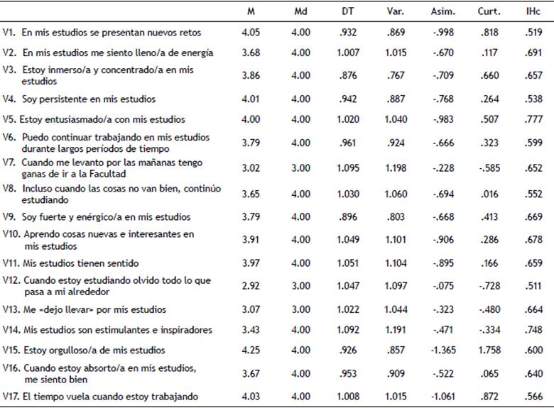 Se han calculado los valores descriptivos, -tendencia central y distribución-, de las variables que componen la escala. Con respecto a la Asimetría (Asim.) y Curtosis (Cur.), se ha observado que las 17 variables, utilizando el rango -2, 2 (Bandalos & Finney, 2010; Muthén & Kaplan, 1985, 1992;) presentaban una buena distribución. El índice de homogeneidad corregido también presenta valores aceptables, todos por encima de .500. Ante estos resultados se ha procedido a realizar el AFE con la totalidad de los ítems.