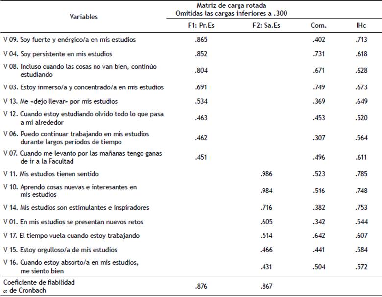 Se ha tomado la decisión de prescindir de las dos variables que cargan en dos factores simultáneamente, la V2 y la V5, y el cuestionario ha quedado configurado con 15 variables distribuidas en dos factores, el F1: Predisposición al estudio (al que se conocerá como Pr.Es) y el factor F2: Satisfacción por el estudio (Sa.Es desde ahora). Los datos de la rotación sin las dos variables omitidas, la Comunalidad (Com.), el Índice de Homogeneidad corregido (IHc) y el Alfa de Cronbach pueden verse en la tabla 3.