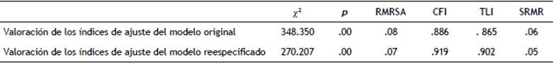 Realizado el AFE, se ha procedido a comprobar los resultados mediante un AFC, utilizando para ello el paquete estadístico MPlus.7 tomado como referencia válida los valores de CFI y TLI ≥ .9, RMRSA ≤ .08 y SRMR ≤ .05. Los resultados han mostrado que la variable 11 carga en la 10 y la variable 13 en la 12, motivo por el cual se ha procedido a la reespecificación del modelo obteniendo resultados favorables (tabla 4).