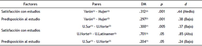 En el factor Sa.Es, los que cursan estudios en una universidad del norte de España obtienen una media significativamente más baja que los que los cursan en la universidad del sur (DM=.300, p<.05 y d=.37) y también más baja que los que estudian en la universidad chilena (DM=.701, p<.05 y d=.85). Al estudiar dichas diferencias en el factor Pr.Es, los resultados indican que también en este factor los estudiantes de la universidad del norte puntúan estadísticamente significativo más bajo que los de la universidad del sur (DM=.204, p <.05 y d =.35). En el resto de comparaciones por pares no han aparecido datos estadísticamente significativos. Ver tabla 6.