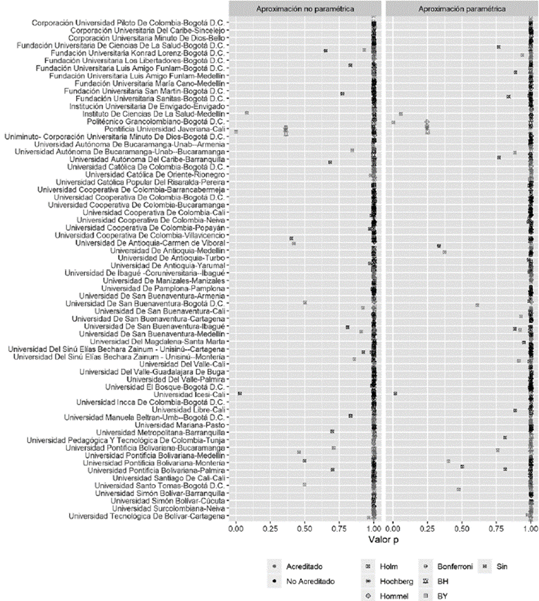 La figura 1 muestra los resultados de los valores p de las pruebas paramétricas y no paramétricas para cada ajuste empleado. La figura representa el tipo de ajuste utilizado, y el color representa si el programa estaba acreditado o no (gris para los acreditados y en negro para los no acreditados).