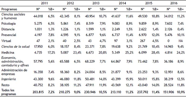 En 2016, el 5% de los estudiantes evaluados pertenecían a un programa de psicología; de estos, 7,4% alcanzaron un nivel intermedio o superior en inglés, mientras que 11,2% del total de programas relacionados con las ciencias sociales y humanas (según SNIES, programas que pertenecen al área de conocimiento: ciencias sociales y humanas) alcanzaron B+. Este resultado fue inferior al de los programas de medicina, en los cuales 24,2% de sus estudiantes clasificó en nivel B+, mientras que todas las ciencias de la salud (según SNIES, programas que pertenecen al área de conocimiento: ciencias de la salud) el 9,4% de estudiantes alcanzaron este nivel. Los programas de administración de empresas clasifican para el mismo año al 8,6% de sus estudiantes en nivel intermedio o superior, mientras que el total de programas del área de conocimiento de economía, administración, contaduría y afines (según SNIES, programas que pertenecen al área de conocimiento: economía, administración, contaduría y afines) clasifican 8,9% y esta cifra es de 12,5% para los programas de ingeniería (según SNIES, programas que pertenecen al área de conocimiento: ingeniería, arquitectura, urbanismo y afines.). El número de evaluados en psicología en 2011 fue de 5.275 estudiantes, este número creció hasta 2015 y cerró en 2016 con 7.602 estudiantes, lo cual representa un crecimiento del 44%. Asimismo, más del 70% de los estudiantes de psicología que presentaron la prueba, pertenecen a programas de modalidad presencial y clasifican mayor proporción de estudiantes en B+ que las modalidades virtual y a distancia, para todos los años de estudio (véase tabla 3).
