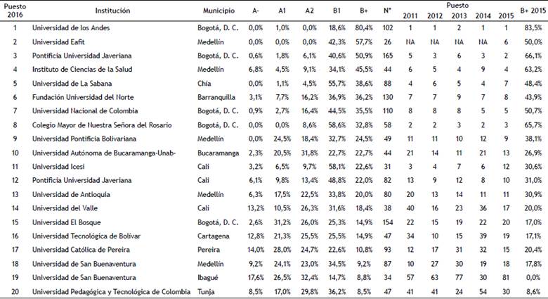 La tabla 4 muestra un escalafón de los 20 programas con mayor proporción de estudiantes clasificados en nivel intermedio o superior en 2016. En ella se presenta la posición en el escalafón desde 2011 al 2016, la institución y municipio donde se ofrece el programa, así como también la proporción de estudiantes que se clasificaron en cada nivel durante 2016 y el número total de estudiantes. En esta tabla se pueden resaltar cuatro puntos. Primero, no existe en Colombia un programa de psicología que clasifique el 100% de sus estudiantes en nivel B+. Segundo, solo 13 programas de 72 clasifican al menos al 20% de estudiantes en nivel intermedio o superior (sin realizar pruebas estadísticas). Tercero, los programas de psicología incluidos en este escalafón pertenecen a instituciones ubicadas en los departamentos de Cundinamarca, Antioquia, Atlántico, Santander, Valle, Bolívar, Risaralda, Tolima y Boyacá; 14 de ellos se concentran en las ciudades de Bogotá, Medellín y Cali. Y cuarto, todos los programas que clasifican al menos el 20% de sus estudiantes en B+, se ubicaron dentro de los primeros puestos en los años anteriores. Cabe aclarar que si bien 13 programas clasifican al menos el 20% de estudiantes en B+, luego se realizarán las pruebas estadísticas correspondientes para determinar el cumplimiento o no de la meta establecida.
