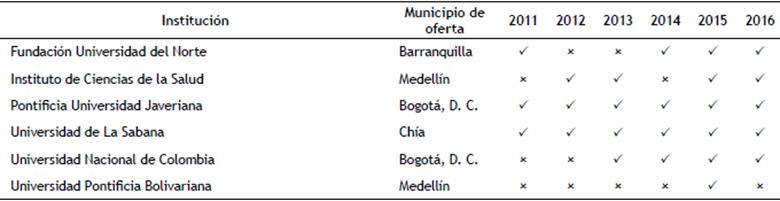 Asimismo, en 2015, según la aproximación paramétrica, nueve de 109 programas cumplieron con la meta (8%), todos son presenciales, y seis de ellos estuvieron acreditados durante 2015. Esos programas corresponden a las mismas IES que cumplieron la meta en 2014, además del Instituto de Ciencias de la Salud (Z(n = 38) = 6.56, p = .00), de la Universidad Eafit (Z(n = 20) = 3.27, p = .04) y Universidad Pontificia Bolivariana (Z(n = 63) = 3.56, p = .003). También se observa que 56% de las universidades que superaron la meta se encuentran ubicadas en Bogotá, con excepción de la Fundación Universidad del Norte, cuya sede se encuentra en Barranquilla, del Instituto de Ciencias de la Salud y de la Universidad Eafit, ubicadas en Medellín. Estos resultados se mantienen en la aproximación no paramétrica a excepción de la Universidad Eafit (X2 (101, N = 102) = 9.45, p = .11), quien no cumple la meta según esta aproximación (todos los demás p valores son cercanos a cero). Por razones de espacio no se presentan los resultados de esta prueba para estos programas; sin embargo, estos se encuentran disponibles para el lector que los desee solicitar (Los resultados se pueden solicitar al autor para correspondencia).