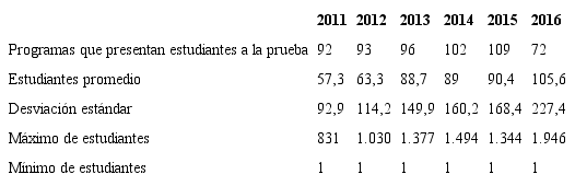 En la tabla 1 se muestra el número de programas que presentaron los estudiantes de psicología a la Prueba Saber Pro: 92 en 2011, 102 en 2014 y 72 en 2016. El número promedio de estudiantes por programa aumentó: de 57,3 a 105,6 desde 2011 al 2016. Para el último año, del programa de psicología de la Universidad del Valle de las sedes Buga y Palmira, 1 estudiante presentó la prueba, mientras que de la Universidad Nacional Abierta y a Distancia, 1.946 estudiantes presentaron la prueba.