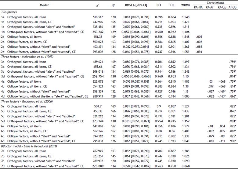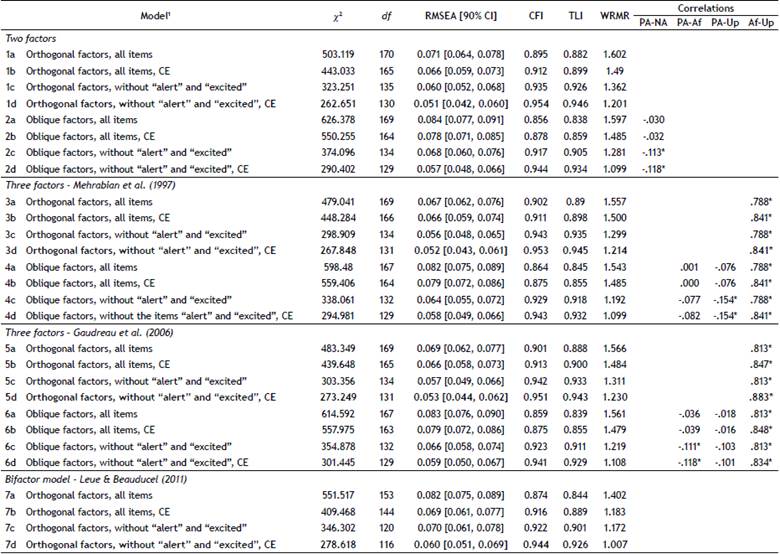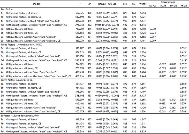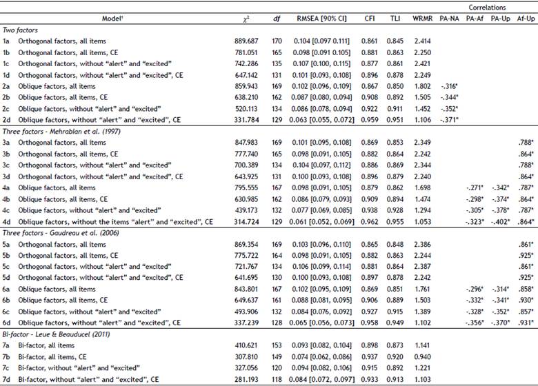 Seven models were examined: (1) Two-factor orthogonal model (PA and NA); (2) Two-factor oblique model; (3) Three-factor model based on Gaudreau et al. (2006), NA split into two correlated factors (Upset and Afraid), which were both uncorrelated with PA; (4) Like model 3, but with correlated factors; (5) Three-factor model based on Mehrabian (1997), NA split into the two correlated factors (Upset and Afraid), which were both uncorrelated with PA; (6) Like model 5, but with correlated factors; (7) Bi-factor model with a three-factor solution, in which PA and NA were un-correlated factors and the loadings of all items on a third uncorrelated more general factor AP (Affective Polarity) were freely estimated (Leue & Beauducel, 2011). For each model presented above, four variants were analyzed: (a) Model with all items; (b) Model with all items, allowing for covariance between errors; (c) Model with all items except alert and excited items, and (d) Model with all items except alert and excited items and allowing for covariance between errors. We add covariance between errors that were comprised in Zevon and Tellegen's (1982) proposal, considering modification index suggested by the software. The items alert and excited were eliminated from the analysis because they presented low factorial loadings (≤ .40) or cross-loadings between factors.