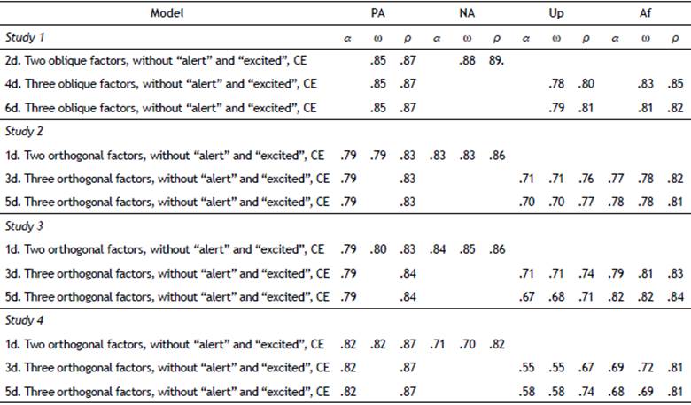 Table 5 shows internal consistency results. Composite reliability values of the best models were between .80 and .89, whereas the omega values were between .78 and .85. The Upset dimension of the model 4d showed the lowest omega coefficient.