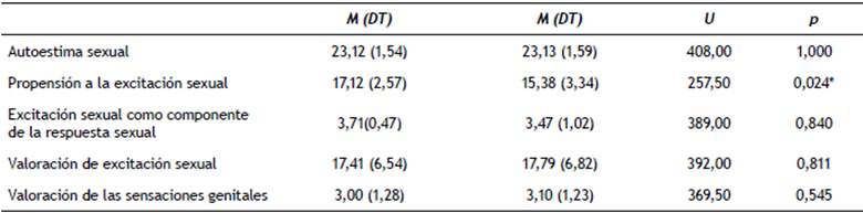 Cuestionario del funcionamiento sexual, del Massachussets General Hospital Sexual Functioning Questionnaire (MGH-SFQ) (Fava, Rankin, Alpert, Nierenberg & Worthington, 1998). Se empleó la versión española de Sierra, Vallejo-Medina, Santos-Iglesias y Lameiras (2012). Se trata de una escala que evalúa el funcionamiento sexual durante el último mes a partir de 5 ítems (interés sexual, excitación sexual, orgasmo, erección -solo para hombres- y satisfacción sexual global). Se responde mediante una escala tipo Likert donde 0 es totalmente disminuido y 4 significa normal. El rango de puntuación oscila entre 0 y 20; menores puntuaciones indican peor funcionamiento sexual. La versión adaptada al español presenta una excelente fiabilidad de consistencia interna (0,90 en hombres y 0,93 en mujeres), así como adecuados índices de validez, correlacionando sus puntuaciones con asertividad sexual, deseo sexual diádico y satisfacción sexual (Sierra et al., 2012). En este estudio se empleó únicamente el ítem relativo a la excitación sexual.