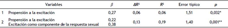 Al calcular los estadísticos descriptivos de las variables y compararlas entre hombres y mujeres (véase tabla 2), se encontraron diferencias significativas únicamente en la propensión a la excitación sexual, obteniendo puntuaciones más elevadas los hombres. Dado que no se encontraron diferencias por sexo en la AS, se consideró a todos los participantes como una sola muestra. Al calcular las correlaciones bivariadas, se observa que la AS correlaciona de forma positiva, tanto con la propensión a la excitación sexual (r = 0,27, p < 0,05) como con la excitación sexual como componente de la respuesta sexual (r = 0,41, p < 0,01) (véase tabla 3).