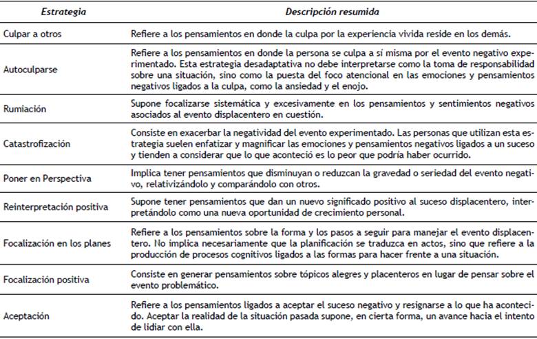 La ansiedad es una emoción y, por lo tanto, se manifiesta en la experiencia subjetiva, en la activación psicofisiológica y en la conducta (Mulligan & Scherer, 2012). En sí misma, es una respuesta adaptativa; pero si se presenta en el momento equivocado, o con un nivel de intensidad inadecuado, puede resultar disruptiva, perjudicar los procesos cognitivos, interferir con la adaptación al ambiente y afectar el rendimiento académico (Domínguez-Lara, Alarcón-Parco, & Navarro-Loli, 2017; Gross, 2014; Jacobs & Gross, 2014; Oros, Manucci, & Richaud-de Minzi, 2011). En consecuencia, es necesario en ocasiones un proceso complementario de regulación de la emoción (Pekrun & Linnenbrick-García, 2012). La regulación emocional supone la activación de diversos mecanismos orientados a evaluar y modificar un estado afectivo en curso, es decir, al ejercicio consciente de la regulación de la emoción (Koole, 2009). Garnefksi, Kraaij y Spinhoven (2001) proponen la existencia de nueve estrategias que nos permitirían regular nuestras emociones a partir de nuestros procesos cognitivos. Estas se detallan en la tabla 1. Según el modelo, y de manera general, las primeras cuatro estrategias resultarían desadaptativas en términos de su utilidad para alcanzar objetivos específicos, y las últimas cinco serían adaptativas.