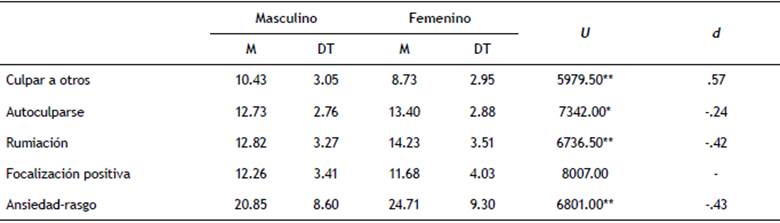 En principio, se determinó si existían diferencias estadísticamente significativas entre las participantes de género femenino y los de género masculino para las variables en estudio. Las estrategias de aceptación, catastrofización, poner en perspectiva, reinterpretación positiva y focalización en los planes han cumplido tanto con el criterio de normalidad como con el de homocedasticidad, por lo que se ha optado por la aplicación de una prueba t de diferencia de medias. Los resultados de la prueba han indicado ausencia de diferencias estadísticamente significativas entre los grupos. Respecto del resto de las variables, es decir, culpar a otros, autoculparse, rumiación, focalización positiva y ansiedad-rasgo, estas no han cumplido, o bien el criterio de normalidad, o bien el de homocedasticidad, por lo que se ha optado por una prueba U de Mann-Whitney. Los resultados de la prueba y el tamaño del efecto de las diferencias (d de Cohen) se muestran en la tabla 2.
