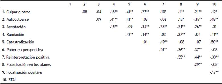 Para evaluar las relaciones entre el nivel de ansiedad y la frecuencia de uso de estrategias cognitivas de regulación emocional, se han realizado, en primer lugar, correlaciones parciales, controlando el efecto del género. Los resultados se expresan en la tabla 3.