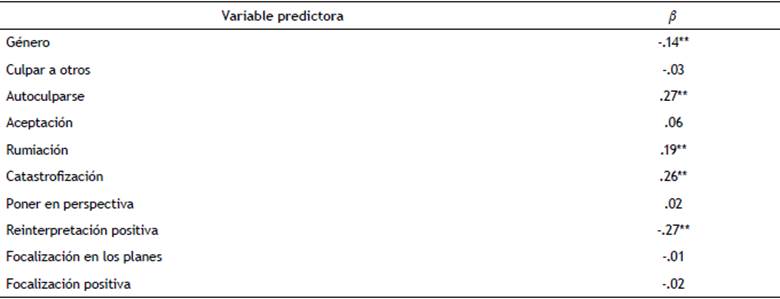 Se observa que el modelo resultó significativo (p < .01), explicando un 46% de la varianza. Los beta estandarizados indican que las estrategias autoculparse, catastrofización y reinterpretación positiva aportan la mayor varianza explicada. Las variables rumiación y género, por su parte, resultaron también predictoras, pero su aporte fue menor.
