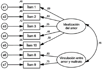 La figura 1 muestra el path diagram con los pesos de regresión estandarizados. Los estimadores son significativos en los siete ítems (p ≤ .01), lo que indica un buen ajuste del modelo estructural. Las cargas son superiores a .35 en todos los ítems, por lo que se confirma la validez de constructo de la estructura bifactorial de 7 ítems: idealización del amor (ítems 1, 2, 3, 6 y 10) y vinculación amor-maltrato (ítems 8 y 9).