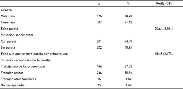 En la investigación participaron 443 estudiantes de diferentes universidades colombianas. El 71.6% eran mujeres y el 28.4% hombres. La edad media fue de 20.67 años (DT = 4.41) en los hombres y 20.62 (DT = 3.70) en las mujeres. Los hombres tuvieron su primera relación de pareja a los 15.66 años (DT = 2.769) y las mujeres a los 15.40 años (DT = 1.891) (t = .944, p = .346). Una mayor cantidad de mujeres (57.7%) que de hombres (46%) tenía pareja en el momento de la realización de la entrevista (X2 = 4.973, p = .026). En la tabla 1 se muestran las principales características de los y las participantes de la investigación.