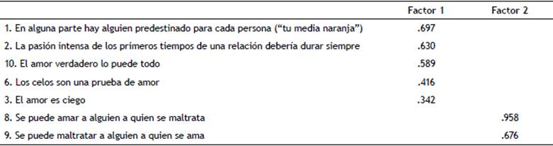 La prueba KMO (Kaiser-Meyer-Olkin) y el test de esfericidad de Bartlett evaluaron la aplicabilidad del análisis factorial. Los estadísticos muestran una adecuación muestral aceptable (KMO = .656; Bartlett = 572.98, p = .000), por lo que se procedió a realizar el AFE de la versión reducida de la escala de mitos sobre el amor. Utilizando como método de extracción mínimos cuadrados generalizados, se encontraron dos componentes con autovalores iniciales mayores a uno que acumulaban el 55.59% de la varianza. La matriz factorial rotada -utilizando como método de rotación Varimax con normalización Kaiser- convergió en 3 iteraciones. En las sumas de rotación de cargas al cuadrado, el factor 1 explicó el 21.77% de la varianza y el factor 2, el 20.68% (varianza total acumulada = 42.44%). En la tabla 2 pueden verse la matriz de componentes rotada y las saturaciones de los ítems. Todos obtuvieron pesos factoriales superiores a .30. La distribución bifactorial coincidió con la obtenida en España (Rodríguez-Castro et al., 2013): idealización del amor (factor 1) y vinculación amor-maltrato (factor 2).