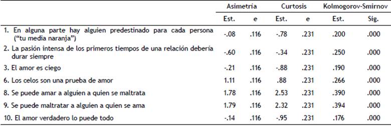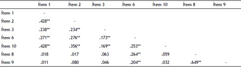 En la tabla 6 se analizan las correlaciones de Pearson entre los 7 ítems que componen la escala. Las correlaciones son significativas entre los ítems del mismo factor, es decir, los ítems del primer factor se correlacionan significativamente entre sí y los ítems del segundo factor también. No ocurre lo mismo entre los ítems de diferente factor, en los que la correlación es no significativa (salvo en el ítem 6). En general, los valores son bajos y positivos. La única correlación moderada (.649) es la que se produce entre los ítems 8 y 9, que pertenecen a la misma subescala (vinculación amor-maltrato).