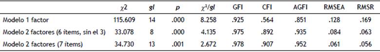 El AFE reportó una estructura de dos factores, sin embargo, el ítem 3 tenía un peso factorial relativamente bajo (.342), por lo que se decidió estudiar su eliminación y poner a prueba las siguientes estructuras: modelo de un factor, modelo de dos factores con todos los ítems, modelo de dos factores sin el ítem 3. La tabla 4 expone los resultados de las pruebas de bondad de ajuste absoluto, incremental y de parsimonia del AFC. Los grados de libertad son superiores a 0, de modo que se trata de un modelo sobreidentificado. El mejor ajuste global es el que se produce en el modelo de dos factores completo, de modo que se decidió mantener todos los ítems y no eliminar el ítem 3. La chi-cuadrado normada es inferior a 3, el error cuadrático medio de aproximación y el residuo cuadrático medio son inferiores a .80 y los índices de ajuste comparativo y de bondad de ajuste son superiores a .90.