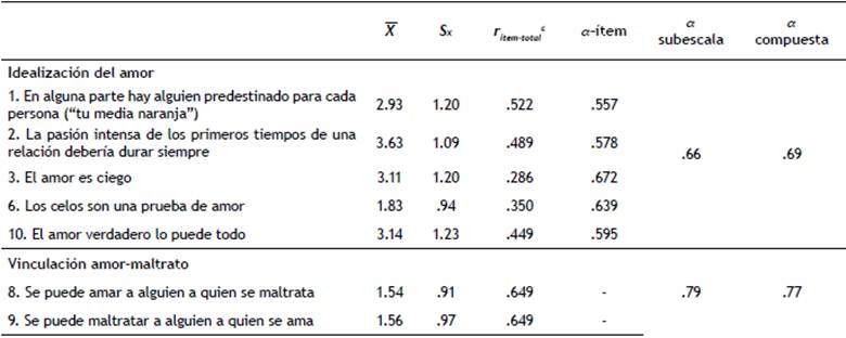 Las propiedades psicométricas de la versión reducida de la escala de mitos hacia el amor se analizan en la tabla 5. Las medias y las desviaciones típicas son más altas en el primer factor que en el segundo. Las puntuaciones en la correlación ítem-total corregida son superiores a .30 en todos los casos, menos en el ítem 3, que tiene un valor de .29. No obstante, tal y como se verificó anteriormente, el ajuste al modelo es mejor si se mantiene el ítem. Además, la fiabilidad total de la escala (α = .64) apenas mejoraría con su eliminación. El alfa de Cronbach de la subescala de idealización del amor es .662 (hombres, α = .714; mujeres, α = .643) y el de la subescala de vinculación amor-maltrato es .786 (hombres, α = .793; mujeres, α = .765). Para evaluar el ajuste del modelo de medida se ha analizado la fiabilidad compuesta de cada uno de los constructos. Esta ha sido .69 en la subescala idealización del amor y .77 en la subescala vinculación amor-maltrato.