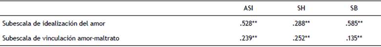 La validez externa se ha evaluado mediante las correlaciones de Pearson entre la escala de mitos hacia el amor y el inventario de sexismo ambivalente (véase tabla 7). Tanto el factor idealización del amor como el factor vinculación amor-maltrato correlacionan significativamente con el sexismo ambivalente, el sexismo hostil y el sexismo benévolo.