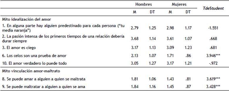 Al comparar las puntuaciones de mujeres y hombres, los resultados ponen de manifiesto diferencias estadísticamente significativas en el acuerdo con varios mitos románticos (véase tabla 8). Los hombres obtienen mayores puntuaciones medias que las mujeres en el ítem 6 (t = 3.946, p = .000), en el ítem 8 (t = 3.619, p = .000) y en el ítem 9 (t = 3.428, p = .001). En cuanto a los resultados totales de cada una de las subescalas, los datos reportan una mayor aceptación de la idealización del amor (M = 2.93, DT = .742) que de la vinculación amor-maltrato (M = 1.55, DT = .852). La media de la subescala idealización del amor es muy similar en hombres (M = 2.96, DT = .801) y en mujeres (M = 2.91, DT = .718) (t = .671, p = .503). En cambio, la subescala vinculación amor-maltrato reporta diferencias estadísticamente significativas, siendo los hombres quienes más puntúan (Mhombres = 1.83, DT= 1.011; Mmujeres = 1.44, DT = .754; t = 3.873, p = .000).