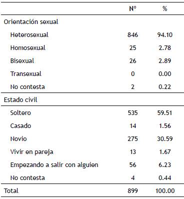 Participaron 899 jóvenes: 397 hombres (44.16%) y 502 mujeres (55.86%), estudiantes de la Universidad de Granada (España), con edades comprendidas entre los 18 y 24 años (M = 20.84; DT = 1.897; hombres: M = 20.930; DT = 1.877; mujeres: M = 20.780; DT = 1.913); no existiendo diferencias significativas entre ambas muestras (t = 1.178; p = .239). Se seleccionaron entre una población inicial de participantes mediante muestreo aleatorio de casos (usando el programa estadístico SPSS), excluyendo aquellos que no habían com pletado alguna de las escalas en su totalidad. La tabla 1 recoge las restantes características sociodemográficas.