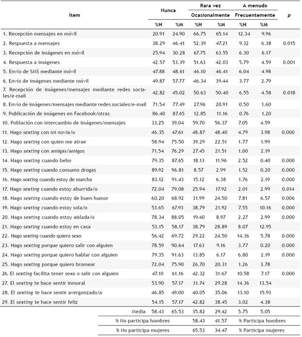 En la tabla 2 se presenta la prevalencia del sexting en cada uno de los ítems tanto en hombres como en mujeres, de acuerdo con la frecuencia producida, y los p-valores re sultantes de la prueba Chi2 en los ítems con diferencias sig nificativas. Se observa predominio de participación mayor en hombres (41.57%) que en mujeres (34.47%), apreciando diferencias significativas en los siguientes ítems: respuesta mensajes de texto o con imágenes provocativos/insinuantes recibido en el móvil, recepción imágenes o mensajes pro vocativos/insinuantes por Internet; hago sexting con mi no vio/a, cuando estoy bebiendo alcohol, fumando marihuana o consumiendo otras drogas; estoy de marcha con amigos/as, aburrida/o, de buen humor, solo/a, aislada/o, porque quiero tener relaciones sexuales, empezar a salir con al guien, hablar con alguien, o porque el sexting hace que tenga más probabilidad de tener sexo o salir con alguien.