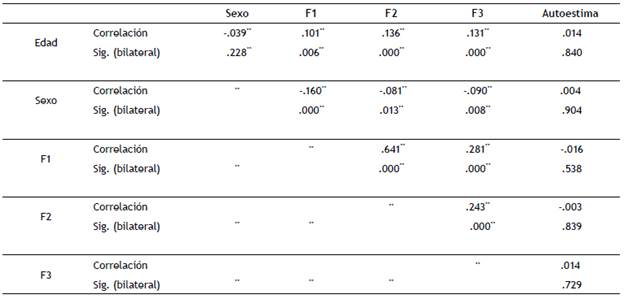 Los resultados del análisis de correlaciones detectaron relaciones significativas y positivas (véase tabla 3), aunque bajas, entre la edad y los tres factores del sexting (F1 -participación real, F2 - disposición activa y F3 - exposición emocional); significativas (también bajas) y negativas entre el sexo y estos; no obteniendo correlación entre autoestima y el resto de variables.