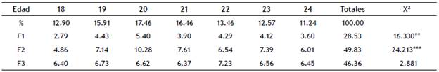Los resultados de la prevalencia de cada factor del sexting por edad, pueden observarse en la tabla 4, la cual muestra el porcentaje de jóvenes que lo realiza. Se cons tata un incremento progresivo desde los 18 a los 20 años y, a partir de ahí, una tendencia decreciente, cifrándose el índice de participación a los 24 años en 11.23%, ligeramente inferior al de los 18 años. Se aprecian igualmente diferen cias significativas en los dos primeros factores, aunque no en el tercero (F3).