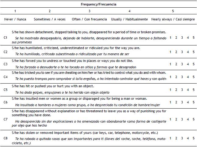 Instruments. This study obtained information from two questionnaires: a socio-demographic information sheet (including the sex and ages of the respondent and his/ her current or most recent partner), and the DVQ-8, a re duced version of the Dating Violence Questionnaire (DVQ; Cuestionario de Violencia de Novios -CUVINO in its origi nal, Spanish version; López-Cepero et al., 2016). This eight-item instrument includes the fusion of contents from the eight scales found in previous DVQ validations (detachment, humiliation, sexual violence, coercion, physical violence, gender-based violence, emotional punishment, instrumen tal punishment), to be answered on a frequency scale of five levels (from 1=never to 5=nearly always). The DVQ-8 is therefore a screening instrument for routine evaluation. This instrument is included in the appendix.