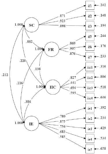 Continuando con las pruebas de evidencias de validez de la EVFI, se procedió a contrastar H3 y H4. Los indicadores de ajuste de la ecuación estructural indican que el modelo es una buena representación de las relaciones observadas (CFI=.962; TLI=.953; RMSEA=.049; Schreiber, 2017). Por tanto, H3 y H4 pueden mantenerse, ya que las puntuaciones de la EFVI, IIC e IE evidenciaron correlaciones positivas y significativas (véase figura 1).