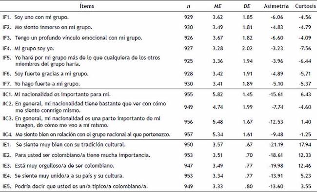 4. La escala ad-hoc de identidad étnica (IE), está constituida por cinco ítems (e.g., "Podría decir que usted es un/a típico/a colombiano/a"). Se extrajeron dos ítems de la escala de identidad étnica validada por Smith (2002). La escala se contestó en un formato de respuesta Likert, con opciones que van desde 1 (muy en desacuerdo) hasta 4 (muy de acuerdo). Altas puntuaciones reflejan una orientación fuerte y positiva hacia el grupo étnico de referencia.