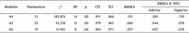De acuerdo con estos resultados, M3 se presentó como la mejor representación de la estructura latente de los ítems de la EVFI, manteniendo una estructura bifactorial del constructo como lo reportan los creadores de la escala (Gómez, Brooks et al., 2011).