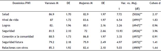 En cuanto a la comparación entre varones y chicas en cada dominio del PWI, se presentan diferencias significativas en todas las medias de BPS en los siete dominios. Las chicas reportaron menor nivel de BPS en todas las áreas de la vida que indaga el PWI (véase tabla 2).