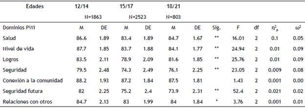 Cuando se analiza por tramos de edad (adolescencia temprana 12 a 14 años, media de 15 a 17 y tardía de 18 a 21) se observan diferencias significativas en las medias de todos los dominios, menos en el de conexión a la comunidad (véase tabla 3); en tanto el w2 reporta un tamaño de efecto bajo. El grupo de adolescencia temprana (12-14) muestra un nivel más elevado de BPS en todos los dominios del PWI en comparación con los adolescentes de mayor edad. Se observa una tendencia decreciente en el nivel de BPS entre los grupos de menor edad y de adolescencia media (15 a 17); nivel de BPS que vuelve a aumentar en los adolescentes mayores (18 a 21), a excepción del dominio sobre seguridad a futuro, que no sigue esta tendencia. Las medias de BPS de este último grupo siguen siendo menores a las de los adolescentes menores (12 a 14). En todos los grupos de edad, el domino en el que informan estar más satisfechos es el de los grupos de pertenencia (conexión a la comunidad) y menos satisfechos con el de seguridad y seguridad a futuro.