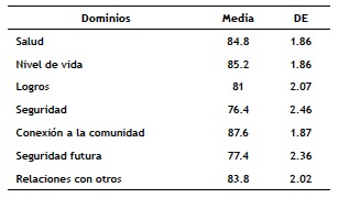 Al observar las medidas en cada dominio del PWI, surge que los adolescentes en Uruguay están más satisfechos con el dominio de conexión a la comunidad (M=87.6; DE=1.87) y nivel de vida (M=85.2; DE=1.86) y menos satisfechos con los dominios de seguridad (M=76.4; DE=2.46) y seguridad a futuro (M=77.4; DE=2.36) (véase tabla 1).